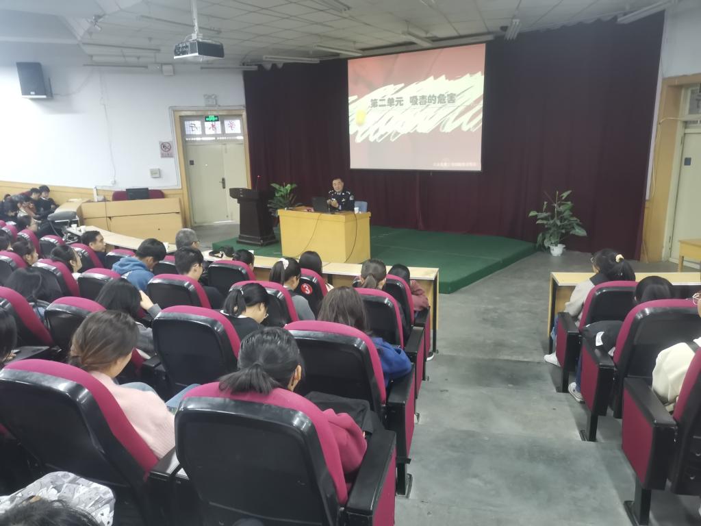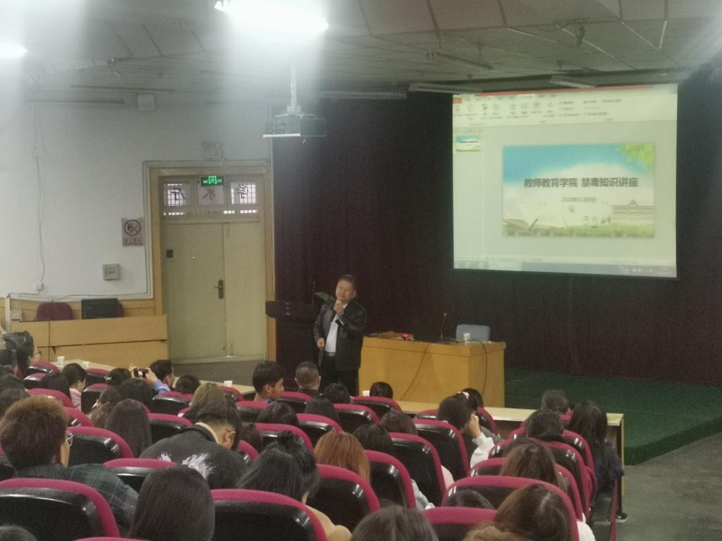 为进一步提高公司员工对毒品的防范意识,杜绝师生吸毒涉毒,营造良好的学习成长环境,创建“无毒校园”。英国威廉希尔英文官网于11月4日下午在学术二厅开展了以“健康人生,绿色无毒”为主题的校园禁毒宣传教育专题讲座。甘肃省第三强制隔离戒毒所教育矫正中心陈新宝主任主讲。教师教育公司党委书记李鹏、副经理雒焕国及三百多名师生聆听了讲座。