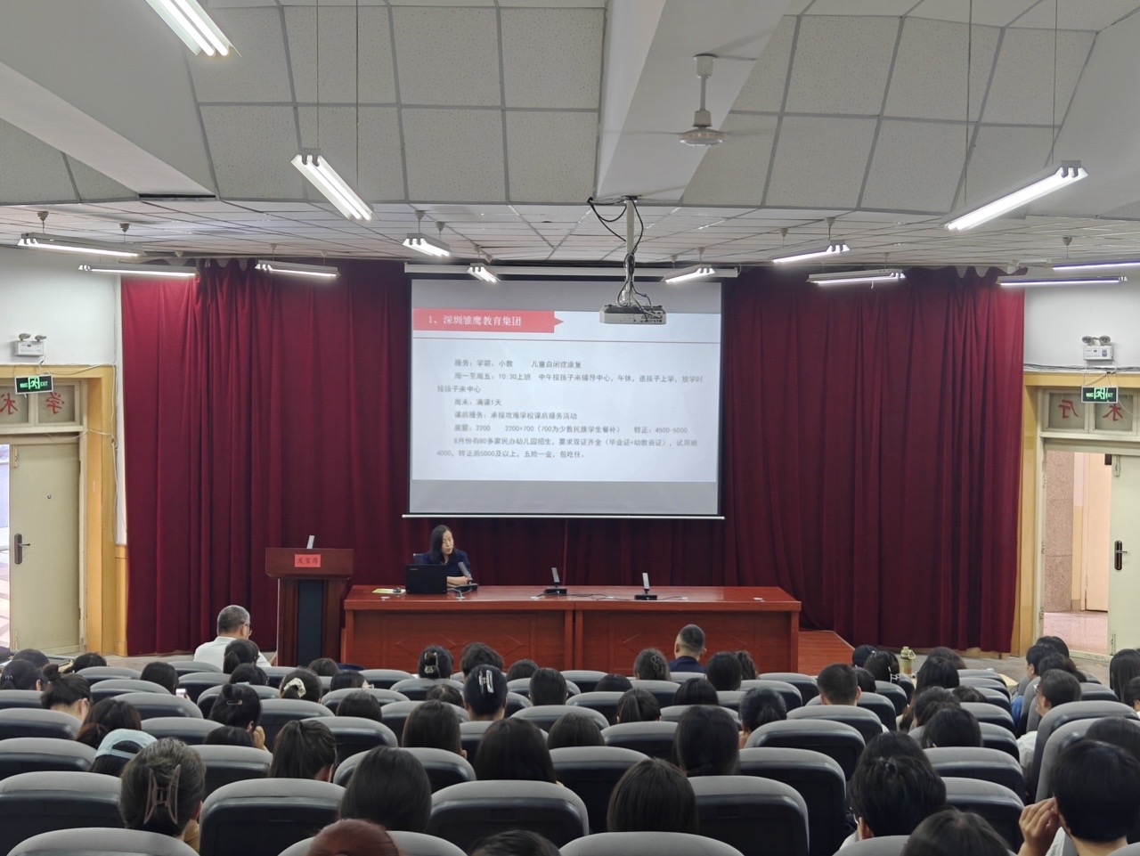 会上,公司经理雒焕国教授从教育实习的重要性、教育实习目的、内容、要求及实习地区等方面对教育实习进行了全面详细地讲解。随后,公司党委书记王莉教授详细介绍了赴深圳、广州等地开展访企拓岗期间走访的雏鹰教育集团、大唐明升教育集团与广州同仁教育集团等三家教育集团的岗位设置、用人需求、薪资待遇及实习带就业等方面的情况,并鼓励同学们要转变就业观念,尽早做好就业规划,为将来高质量就业做好各方面的准备。