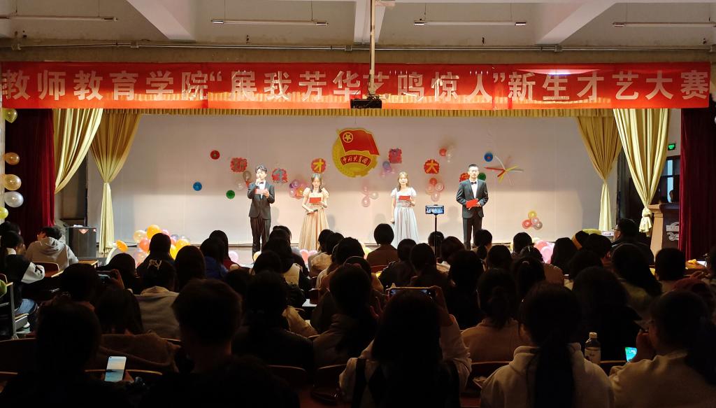 10月18日晚,英国威廉希尔英文官网在团委四楼多功能厅举办教师教育文化节系列活动之“展我芳华·艺鸣惊人”新生才艺大赛。现场2023级全体新生观看了比赛。